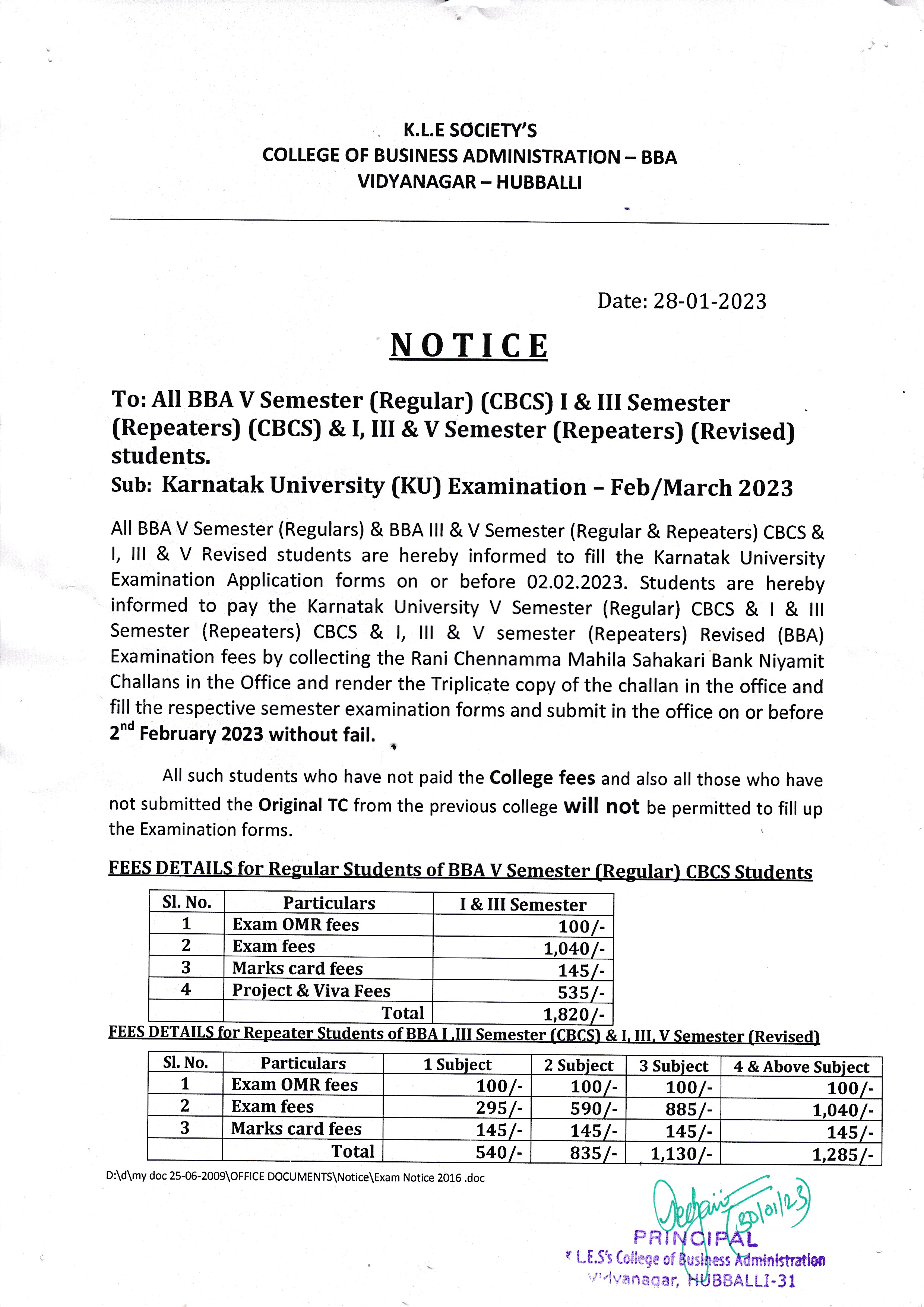 BBA 6th Semester Marks card Notice |